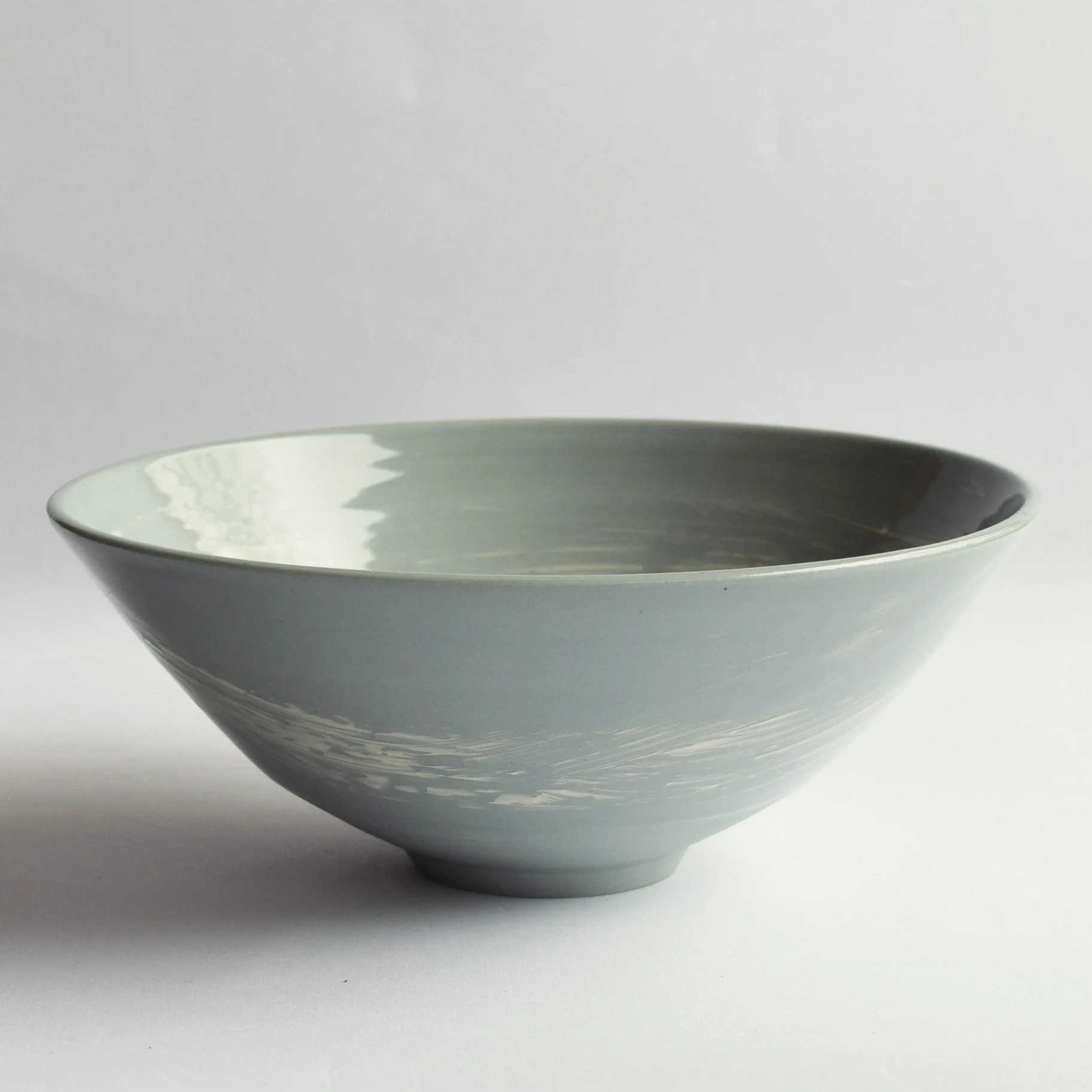 Custom stained slate grey-blue porcelain bowl with hakeme white porcelain brush strokes and clear glaze.