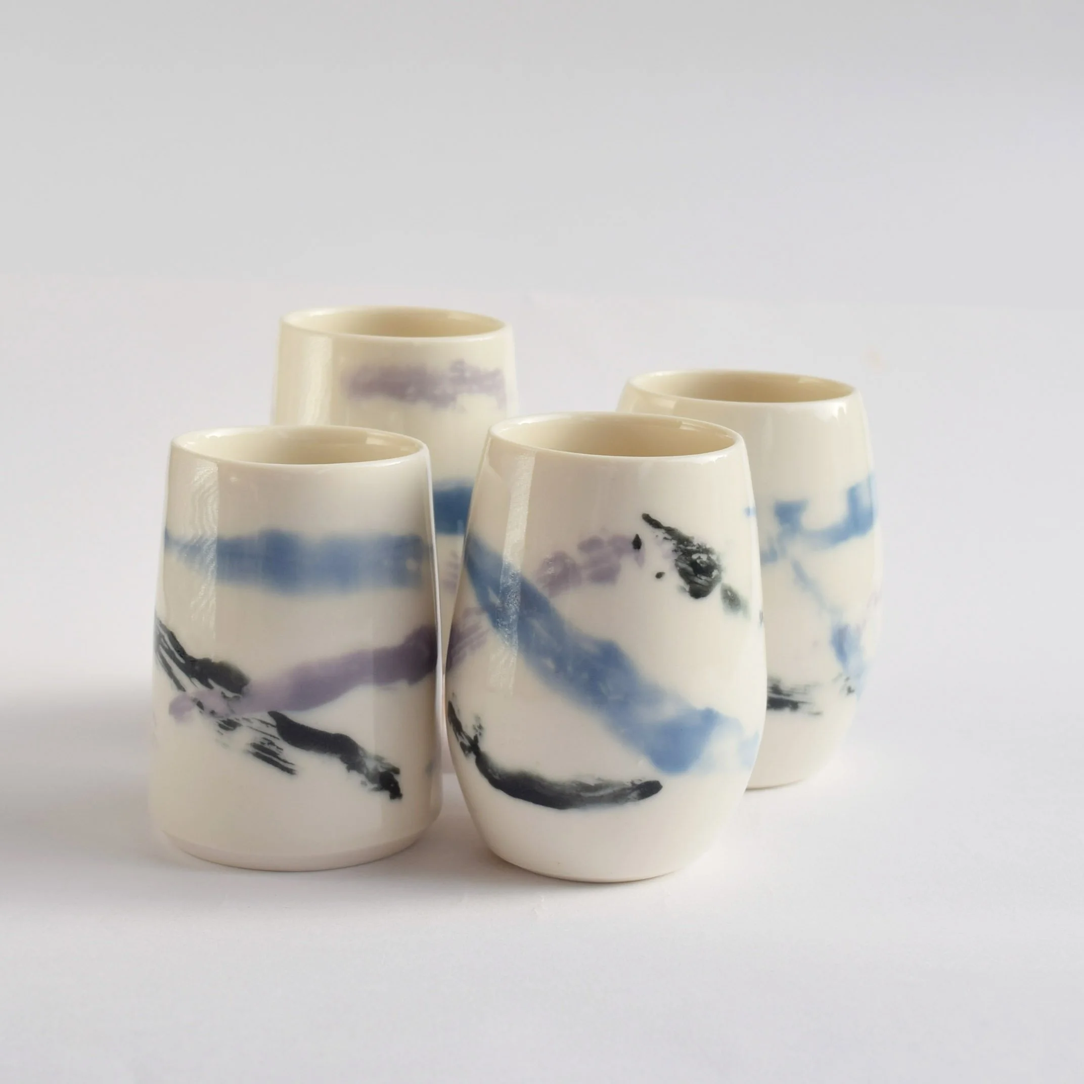 Small wheel-thrown conical porcelain vases with coloured porcelain slip decoration ‘Winter’, inspired by a recent visit to Norway - the tree lines and tracks on snow covered mountains around the coastline.