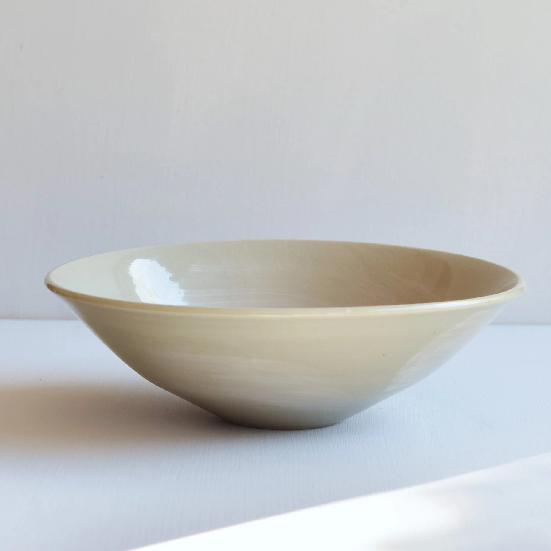 Custom stained sage green porcelain bowl with white porcelain brush strokes and clear glaze. This bowl has a small fault in the glaze on the inside (see pic) and tiny irregularities where grog has come through from the clay but is otherwise in good order.